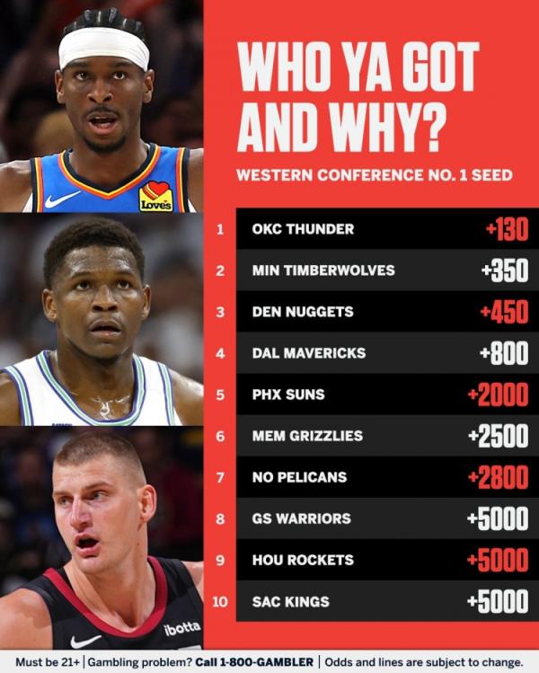 ESPN晒新赛季西部榜首赔率:雷霆+130第一 森林狼&掘金居其后